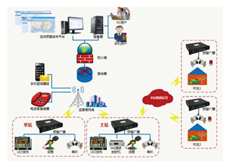 无线预警广播系统中心平台设于指挥中心,2.5G/3G/4G等无线通信方式传送广播信号和控制信号,对于个别移动公网信号较弱区域的远端站采取设置调频广播弥补,实现无线预警广播信号的全覆盖,无需架设广播信号传输线路。远端广播站设备电源由太阳能电板、风力电机和蓄电池提供,不需要从外部引接市电电源线,运行维护方便,中心平台能实时监控系统各设备状态,自动化程度高。